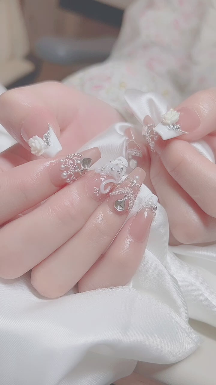 手工立體浮雕的天鵝配上山茶花,氣質爆棚的美甲款式,配上閃鑽和小鋼珠拼出鑽石頸鏈的形狀,讓你的指尖成為全場焦點。