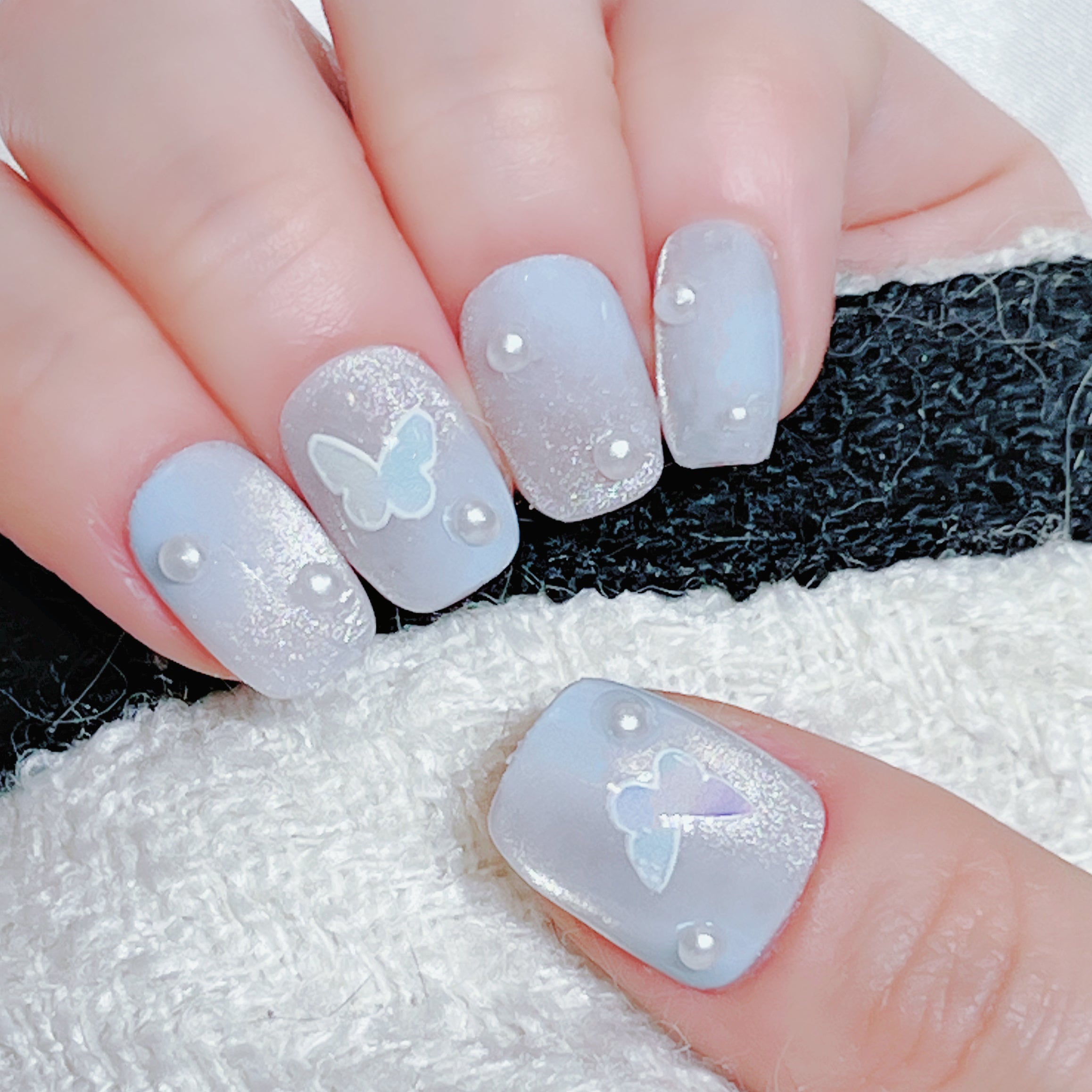 以白開水貓眼作底色,配搭藍色暈染,雖然簡單但絕不失精緻細膩感,貼上蝴蝶形狀的貼紙印上白色彩繪膠,很適合婉約可人又氣質型的美女!