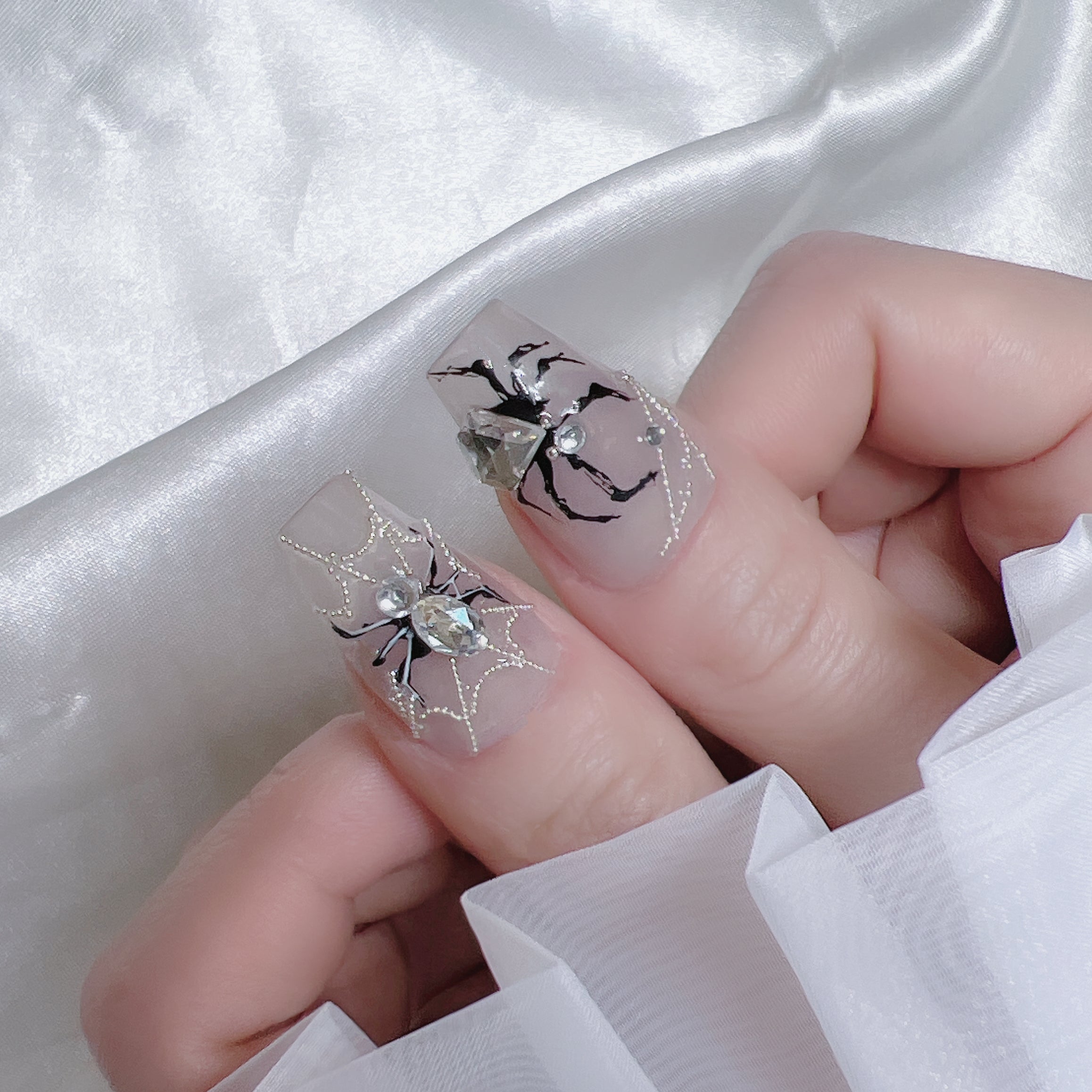 用裸粉色打底,配上經典不敗的法式,再畫上蜘蛛圖案,用小小的蜘蛛網延伸法式邊框,貼上小鑽飾和小鋼珠,為整套美甲的細節感再作昇華,高雅氣質中帶點節日氣氛,很適合低調而有個性的你。